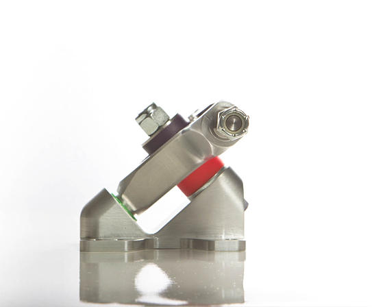 When using tall bushings you do not require to use a boardside washer. Killers are shipped with a 2.5" zinc plated kingpin which is meant to be used with a tall barrel boardside and a standard height barrel roadside. To use a double tall barrel set up a 2.75" kingpin is necessary. When using standard height bushings you require to use a spacer boardside to make up for the empty space. This provides the freedom to use a wide variety of bushings. Flat washers both for boardside and roadside are included with Killer Trucks. It's very important to maintain correct geometry in any set of trucks. The hanger should always be parallel to the baseplate. Make sure you set up your bushings correctly to maintain perfect alignment and geometry. Killer Trucks come with replaceable stainless steel axles pre-installed with Red Loctite, axle nuts, grade 8 kingpin and nut.